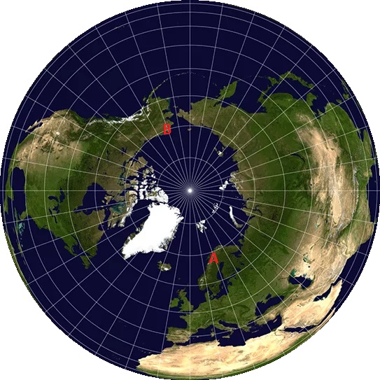 Betrachte etwa auf der folgenden Abbildung den Punkt A in Nord-Norwegen und den Punkt B irgendwo in Alaska, auf